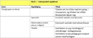 I kvar situasjon som oppstår, må det vurderast kor alvorleg hendinga er. Hending og tiltak må sjåast i samanheng med barnets alder, og kva for konsekvens som vil vera hensiktsmessig. Er ein usikker skal ein alltid ta opp saka med leiar. Elevar mellom 6-10 år vil ha mindre impulskontroll enn eldre elevar. Tiltak må derfor sjåast i samanheng med dette.