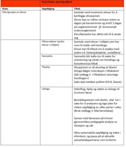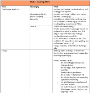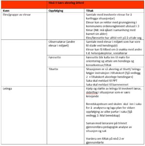 Etter kvart som elevane blir eldre, vil valdelege handlingar bli av meir alvorleg art, både når det gjeld konsekvensar av åtferd og av tiltak som blir iverksett. Det er viktig med tett og godt samarbeid med heimen. Ein må vurdera på nivå 1 om det skal tas kontakt, og det skal alltid tas kontakt på nivå 2 og 3. Tett og godt samarbeid med heimen er viktig i arbeidet for både førebygging og handtering av vald. Vurdering av alvorsgrad av hendingar skal gjerast i samarbeid mellom tilsett og næraste leiar. Eleven må i alle ledd få informasjon om kva som vil skje vidare.