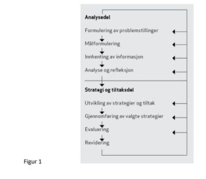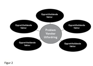 Figuren syner at det er to hovuddelar i modellen med eit tydeleg skilje mellom analysedelen og strategi- og tiltaksdelen. Før ein vurderer tiltak skal ein ha gått gjennom stega i del 1. I arbeidet med å identifisera kva faktorar i situasjonen som løyser ut eller opprettheld eleven eller klassen/gruppa sine utfordringar er det nyttig å bruka verktøyet samanhengssirkelen som vist i figur 2.