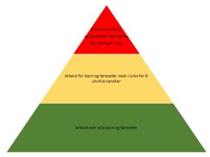 På det grøne nivået finn ein grunntenestane som nær alle barn og unge nyttar seg av, hhv. skulane, barnehagane og helsestasjonstenesta. Kommunen har som mål at færrast mogleg skal trenge ekstra hjelp og støtte utover det alle barn får tilbod om gjennom det førebyggjande arbeidet som skjer i grunntenestane, og difor har ein stort fokus på å styrka grunntenestane sitt førebyggande arbeid. Det er arbeidet som skjer på dette området denne planen vil handla om.